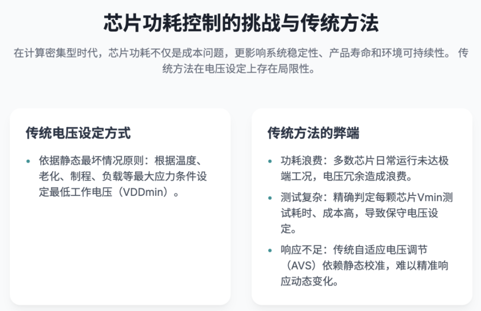 傳統的自適應電壓調節(AVS)機制雖能實現一定程度的動態電壓調整,但通常依賴靜態校準曲線和固定裕度,難以對運行中實際負載、路徑延遲變化做出精準響應。