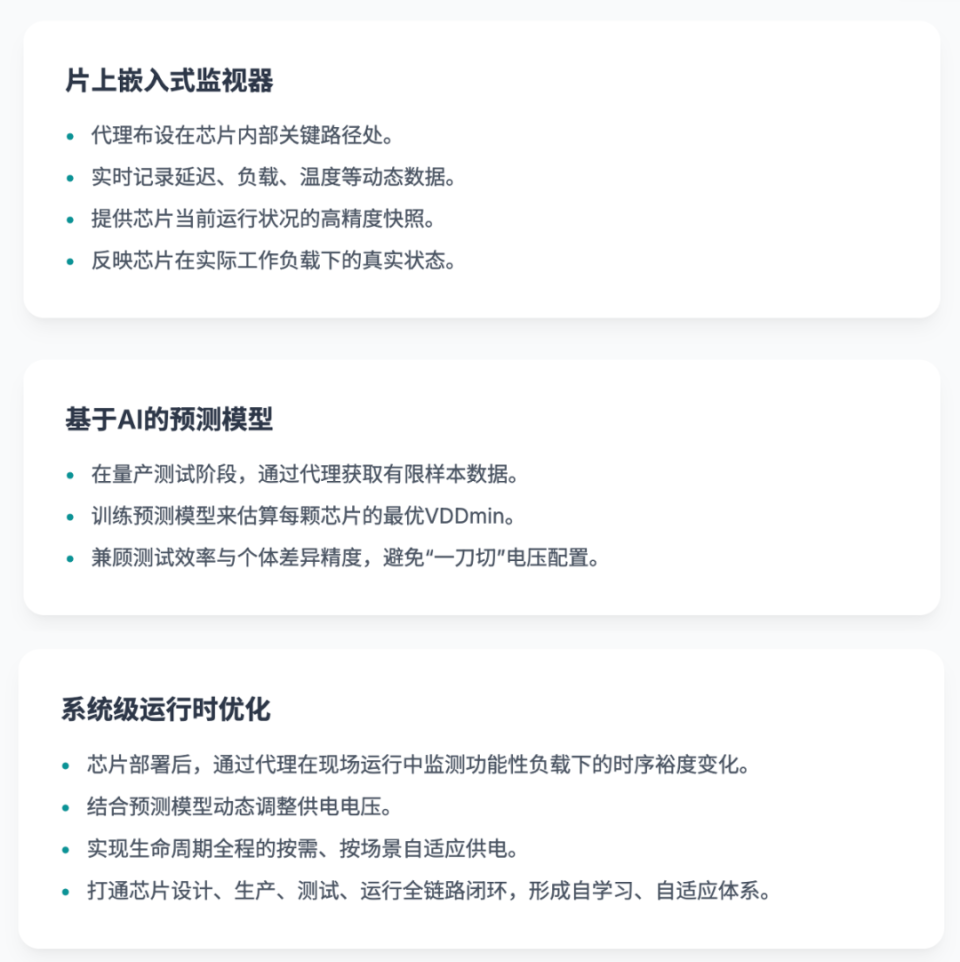 其核心機制在于:通過嵌入式片上代理(embedded agents)對芯片關鍵路徑進行實時監測,結合機器學習模型預測每顆芯片、每一運行環境下的最優VDDmin,從而實現更為精細的動態供電控制。