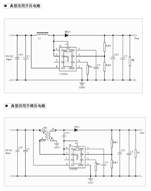 •主要特點:VIN: 12~100V(OUT:ADЛ;集成7A 100V (10A 100V) MOS;集成 180V 高壓啟動電路;多模式控制、無異音工作;支持升壓、降壓和升降壓拓撲;默認14.3V 輸出(FB 腳懸空);待機功耗低于 50mw;良好的線性調整率和負載調整率;集成軟啟動電路;內部保護功能;過載保護 (OLP):逐周期電流限制(OCP);輸出過壓保護(OVP);VDD 過壓、欠壓和電壓箝位保護