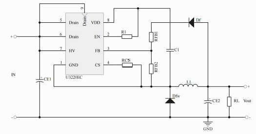 •主要特點:集成 7A 100V MOS;集成 200V 高壓啟動電路;使用范圍:VIN-VOUT>3V,Ip*<3A;BUCK&BOOST兼容;低功耗模式工作;支持降壓和升降壓拓撲;待機功耗低于 50mw;良好的線性調整率和負載調整率;集成軟啟動電路;內部保護功能:過載保護(OLP);逐周期電流限制(OCP);輸出過壓保護(OVP);VDD 過壓、欠壓和電壓箝位保護