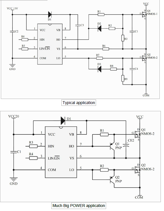•主要特點(diǎn):可完全工作到+600V,可耐受負(fù)瞬態(tài)電壓,抗v /dt,柵極驅(qū)動(dòng)供電范圍從5到20V,欠壓鎖定,3.3V, 5V和15V輸入邏輯兼容,防交叉?zhèn)鲗?dǎo)邏輯,兩個(gè)通道的傳播延遲匹配。
