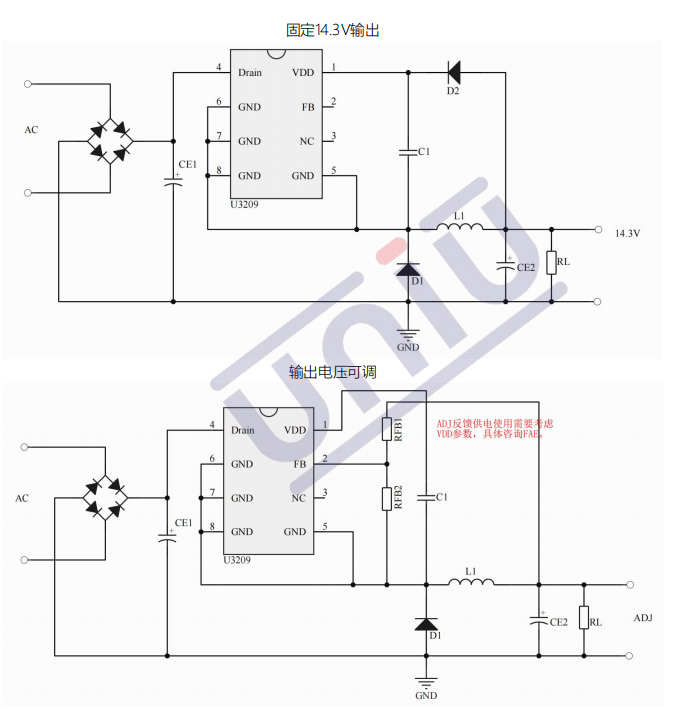 l集成 9Ω 480V MOS l 集成 480V 高壓啟動電路 l 多模式控制、無異音工作 l 支持降壓和升降壓拓撲 l 默認14.3V輸出(FB腳懸空) l 待機功耗低于 50mW l 良好的線性調整率和負載調整率 l 集成軟啟動電路 l 內部保護功能: Ø 過載保護 (OLP) Ø 逐周期電流限制 (OCP) Ø 輸出過壓保護 (OVP) Ø VDD 過壓、欠壓和電壓箝位保護