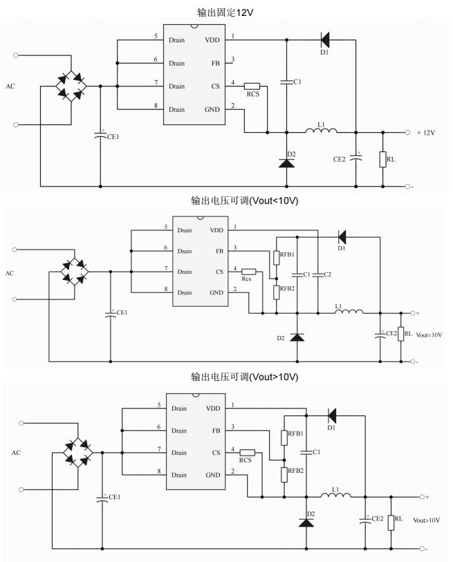 •主要特點(diǎn):集成 650V 高壓?jiǎn)?dòng)電路;多模式控制、無(wú)異音工作;支持降壓和升降壓拓?fù)?默認(rèn) 12V 輸出( FB 腳懸空);待機(jī)功耗低于 50mW;良好的線性調(diào)整率和負(fù)載調(diào)整率;集成軟啟動(dòng)電路;內(nèi)部保護(hù)功能 :過(guò)載保護(hù) (OLP);逐周期電流限制 (OCP);輸出過(guò)壓保護(hù) (OVP);VDD 過(guò)壓、欠壓和電壓箝位保護(hù)