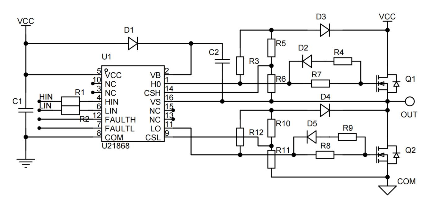 U21868是一款高壓半橋柵極驅動芯片,設計用于高壓、高速功率MOSFET和IGBT。具有獨立的高側和低側參考輸出通道。U21868的邏輯輸入電平兼容低至3.3V的CMOS或LSTTL邏輯輸出電平。內部集成了高、低側欠壓鎖定電路,高、低側過流保護電路,輸出具有大電流脈沖能力,輸出電流能力可達4A。U21868其浮動通道可用于驅動高壓側N溝道功率MOSFET和IGBT,浮地通道工作電壓最高可達600V。